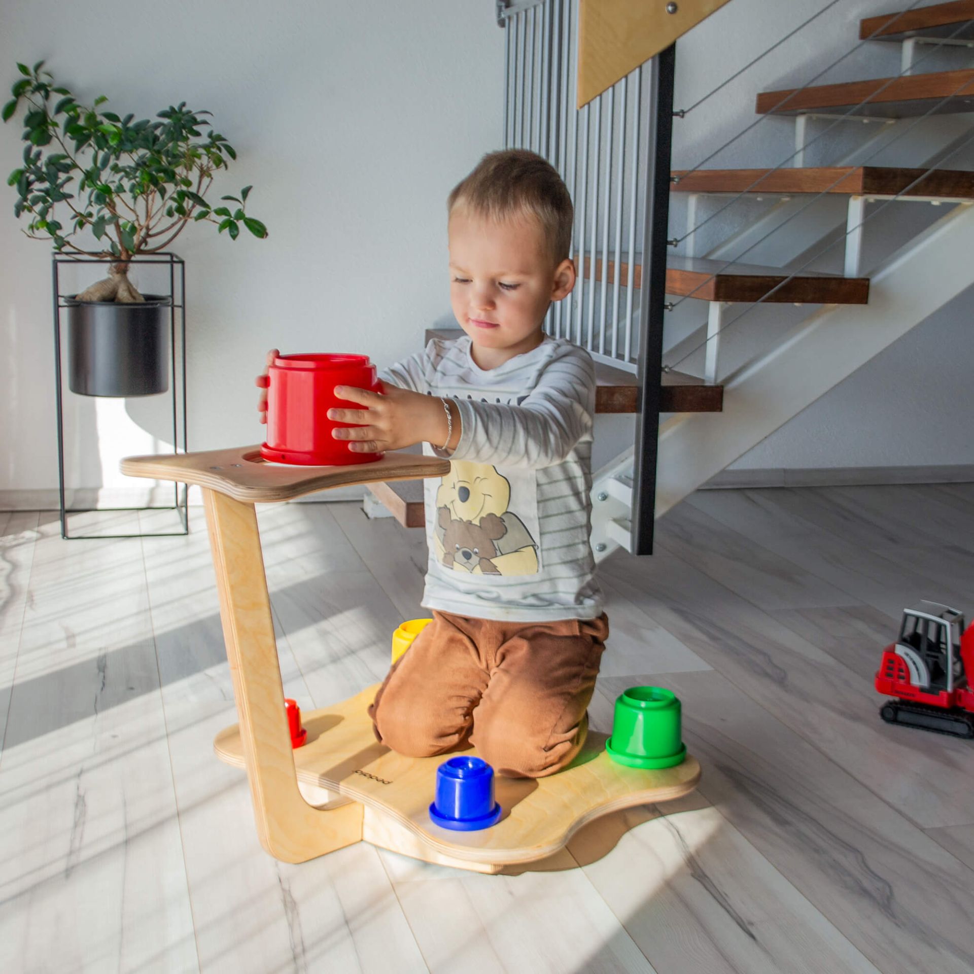 Der große, ebenfalls geschwungene Abstellteller ist durch seine Form und die schön abgerundeten Kanten sehr angenehm zu greifen. Er bietet dem Kind guten Halt, selbst dann, wenn bereits schon Becher aufgestapelt sind.Extra kindgerechte Ausführung – bereits für 2-Jährige