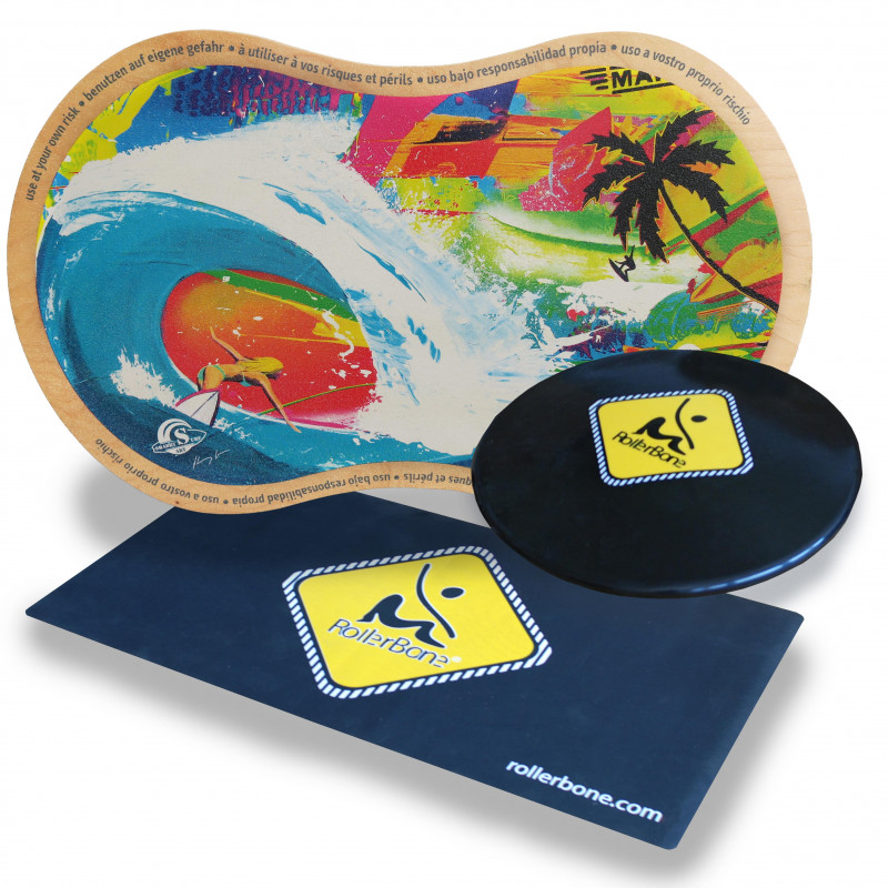 RollerBone erweitert seine Produktlinie an Balance Boards durch neue Designs. Das RollerBone Shabby 1.0 im trendigen Surf-Look spricht vor allem Wasser- und Boardsportler an und will sie gezielt für das Training auf dem Brett begeistern. Zu diesem Zweck hat RollerBone das erste Projekt in Zusammenarbeit mit dem Hamburger Künstler Flemming Peter realisiert, dessen Label Shabby Surf Art in den vergangenen Jahren in der Surfszene zu einem Begriff geworden ist. Balance Boards sind als ergänzende Trainingsgeräte heute aber aus vielen Disziplinen nicht mehr wegzudenken. RollerBone sucht deshalb weitere Künstler mit Bezug zu anderen Sportarten für neue innovative Board-Designs.Aufblasbares RollerBone SoftPad Luftkissen