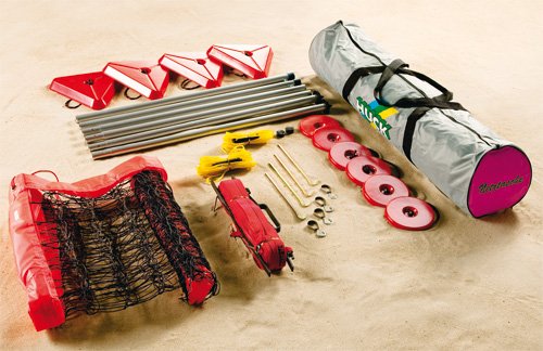 Maximale Pfostenhöhe: 2.45 m. Beachvolleyballnetz 9.5 x 1 m, mit breitem Einfassband in Neonpink.