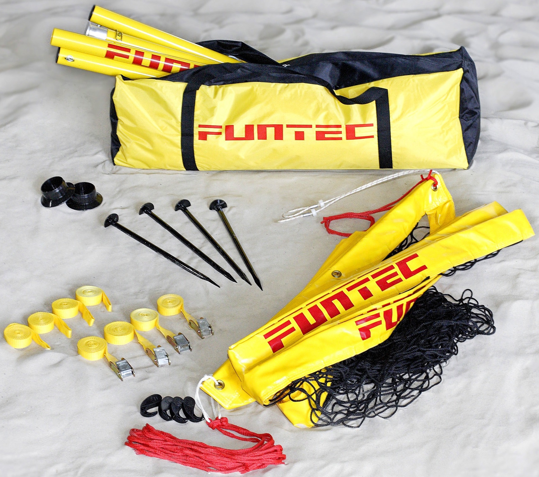 Die Anlage wird mit Spanngurten befestigt, sodass die Netzpfosten noch stabiler stehen. Schneller Auf- und Abbau durch einfaches Stecksystem.