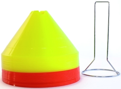 Weicher, flexibler Kunststoff. Mit vier Einbuchtungen oben zum Einlegen von Turnstäben. Set aus 30 Tellern (15 Gelb, 15 Rot).