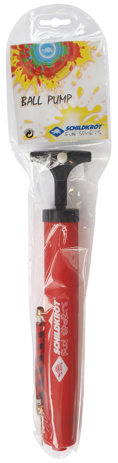 Freizeit-Ballpumpe aus rot-schwarzem Kunststoff. Pumpt jeden Fuß-/ Volley-/ Foot- oder Basketball auf. Jedoch am liebsten die coolen Neoprenbälle von Schildkröt. Sicherer Halt durch den Griff und die etwas längere Bauweise. Inklusive Luftschlauch und 2 Ventilnadeln aus Metall zum Aufschrauben. Im wiederverschließbaren Polybag mit Druckknopf.ACHTUNG! Verletzungsgefahr durch Injektionsnadel, daher Aufpumpen nur durch Erwachsene. Nadel für Kinder unzugänglich aufbewahren. Verschluckungsgefahr.