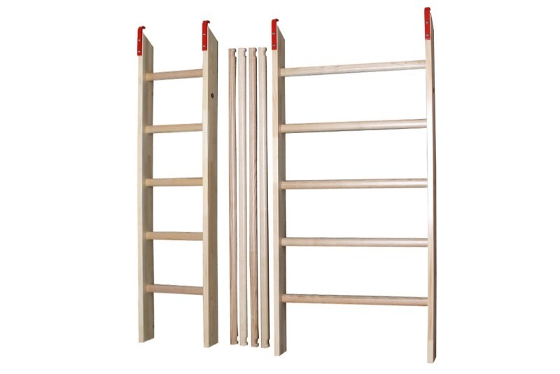 Unser Klettersystem «ABC» beinhaltet: 1 schmale Leiter «A» 163 x 45 cm, 1 breite Leiter «B» 163 x 87 cm und 4 Ovalsprossen «C» 152 cm (max. Belastung