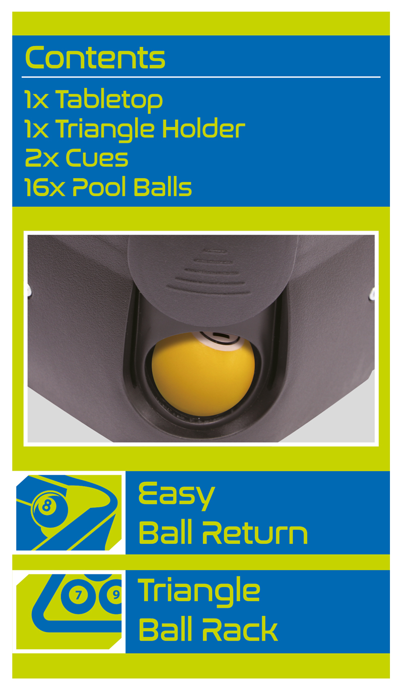 Grosser Spielspass im kleinen Format - der neue Mini-Billiard-Tisch von Schildkröt bietet perfekten Spielspass bei jeder Gelegenheit, ist vielseitig einsetzbar und durch seine kompakte Grösse (50 x 30 x 9cm) und das geringe Gewicht (nur 1,3kg) einfach zu transportieren und zu verstauen. Das Set beinhaltet neben dem Mini-Tisch 2 Queues (50cm), 16 Billardkugeln (Ø 2,6cm) und ein Triangel zur Anordnung der Kugeln. Die versenkten Kugeln werden in den 6 Kunststofftaschen aufgefangen und können über einen praktischen Schiebemechanismus wieder entnommen werden. Der Mini Billiard Tisch ist aus robustem Kunststoff konstruiert, steht idealerweise auf einem keinen Tisch (Stehtisch) und ist mit Anti-Rutsch Füßen ausgestattet. Geeignet für das spielerische Training der Hand-Auge-Koordination bei Kindern.Über Schildkröt: Die über 100 Jahre alte deutsche Marke Schildkröt gilt als Erfinder des Tischtennisballs. Heute bietet Schildkröt neben Tischtennis auch eine sehr umfangreiche Funsport-, Rollsport- und Fitness-Kollektion an und gilt in gewissen Bereichen als Marktführer. Die Produktentwicklung erfolgt ausnahmslos in Deutschland. Die weltweiten Produktionsstätten werden streng überwacht und genügen höchsten Sozialstandards.
