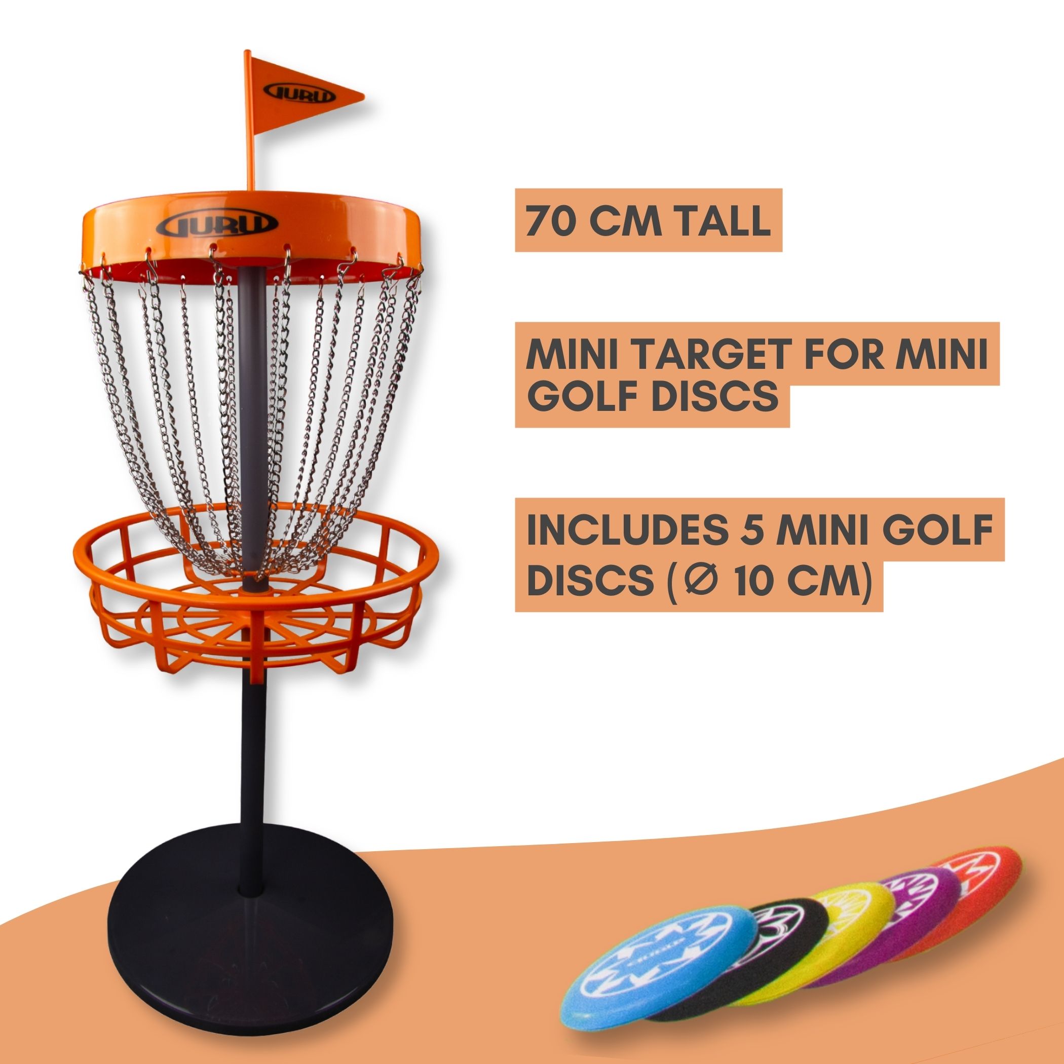 THROW IT SHORT, THROW IT FAR! Erlebe ultimativen Discgolf Spaß mit dem Disc Golf Mini Basket Set von Guru. Mit diesem Set hat man alles, was man benötigt, um die Frisbeegolf-Qualitäten zu trainieren und Freunde und Familie zu einem spannenden Match herauszufordern. Einen kleinen Frisbeegolf-Korb in Höhe von 70 cm und fünf Minifrisbees mit einem Durchmesser von ca. 10 cm. Der Korb hat selbstverständlich die klassischen Metallketten zum Auffangen deines Wurfs. Wechselt euch ab und zielt mit den Minifrisbee auf den Korb. Wer brilliert durch Treffsicherheit?Hinweis: Bitte beachte, dass es insbesondere durch die Verwendung unterschiedlicher Displaytechnologien und aufgrund Deiner individuellen Displayeinstellungen zu Verfälschungen bei der Farbdarstellung kommen kann. Die auf Deinem Display dargestellten Farben können deswegen geringfügig von der tatsächlichen Farbe der auf unseren Produktfotos dargestellten Produkte abweichen. Im Zweifel empfehlen wir Dir, die Produktfotos auf einem weiteren Display zu betrachten oder uns zu kontaktieren.