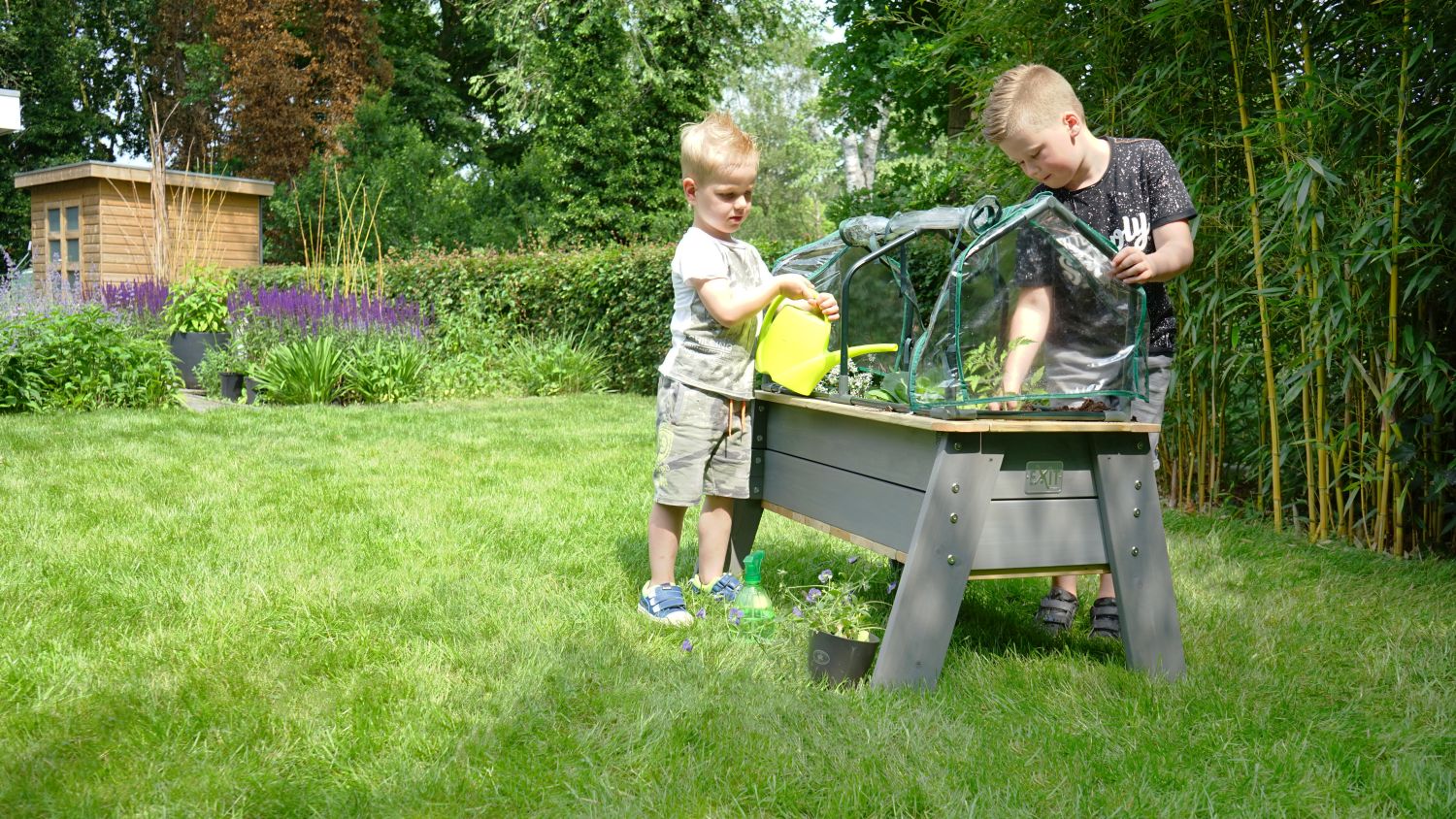 Mit dem EXIT Aksent Hochbeet L mit Gewächshaus und Gartengeräten lernen Kinder spielend mit der Natur umzugehen. Sucht zusammen die Pflänzchen aus, die in die Erde eingepflanzt werden können, denn Kinder können mit den Hochbeeten von EXIT Toys selbst für ihre Pflänzchen sorgen. Das EXIT Aksent Hochbeet L steht auf Beinen, sodass du stehend und mit mehreren Kindern zugleich gärtnern kannst. Das Gewächshaus sorgt dafür dass du bei Wind und Wetter Pflänzchen ziehen kannst. Auch gegen Wind, leichten Frost und Ungeziefer werden die Pflänzchen optimal geschützt.Die Aksent Hochbeete von EXIT Toys wirden aus FSC-zertifizierter Kiefernholz (FSC 100%, FSC® SCS-COC-007799) hergestellt. Dieses Holz kommt aus Skandinavien und ist von hoher Qualität. Das EXIT Kiefernholz wird unter hohem Druck imprägniert. Dies gewährleistet eine möglichst lange Lebensdauer und das Holz braucht keine weitere Behandlung.