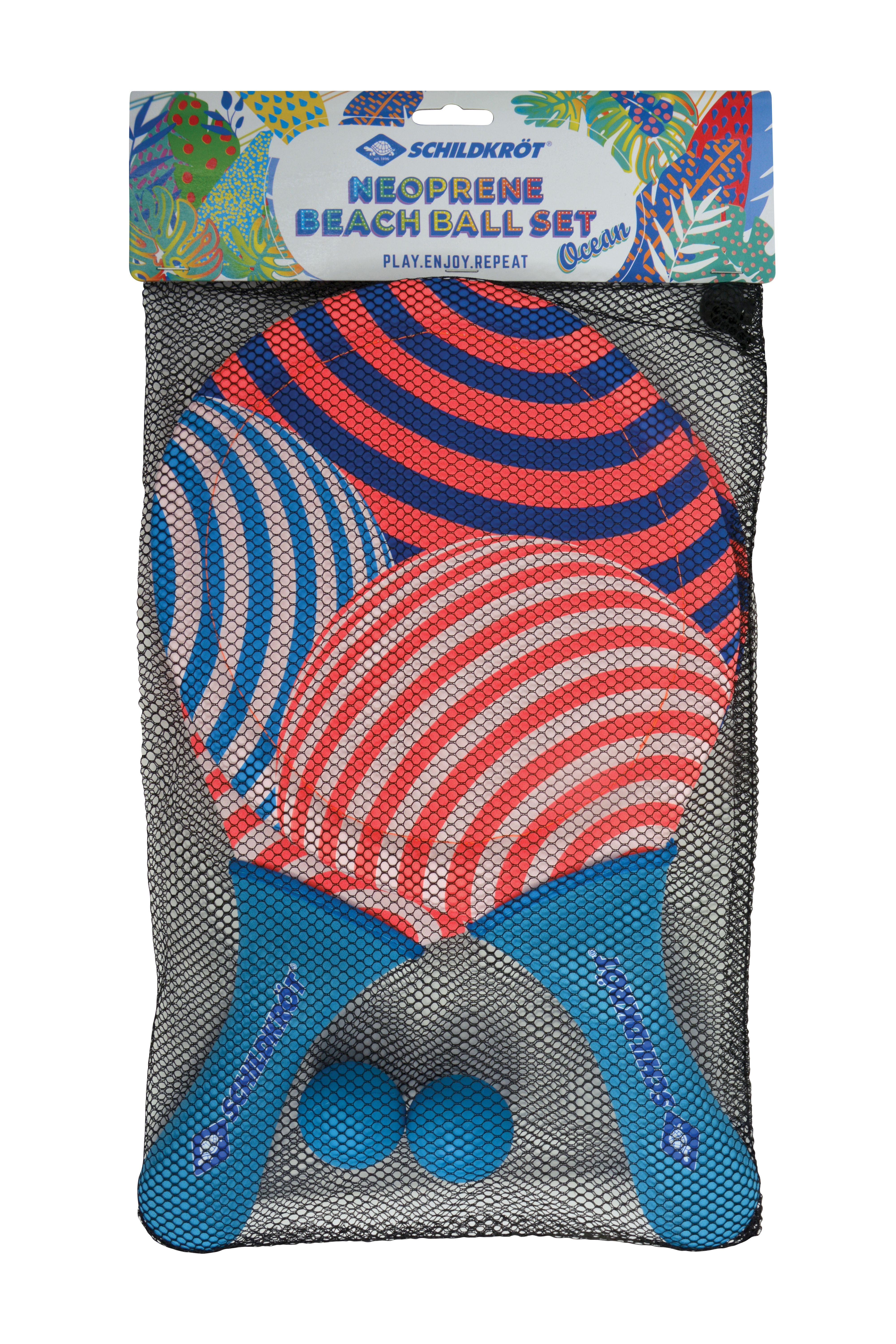 Neopren Beachball Set bestehend aus 2 Schlägern mit Print.Die Schläger sind mit elastischem Neopren bespannt für maximalen Katapult-Effekt (Länge 40 cm, Breite 22,5 cm, Stärke 0,8 cm), 2 Bälle aus Gummi (Ø40mm), in wiederverschließbarer Netztasche mit Kordelzug. Im Vergleich zu den altbekannten Holz-Beachball Sets bestechen die Neopren Beachball Sets durch einen deutlich weiteren Ballflug durch den hohen Trampolineffekt des elastischen Neoprens.