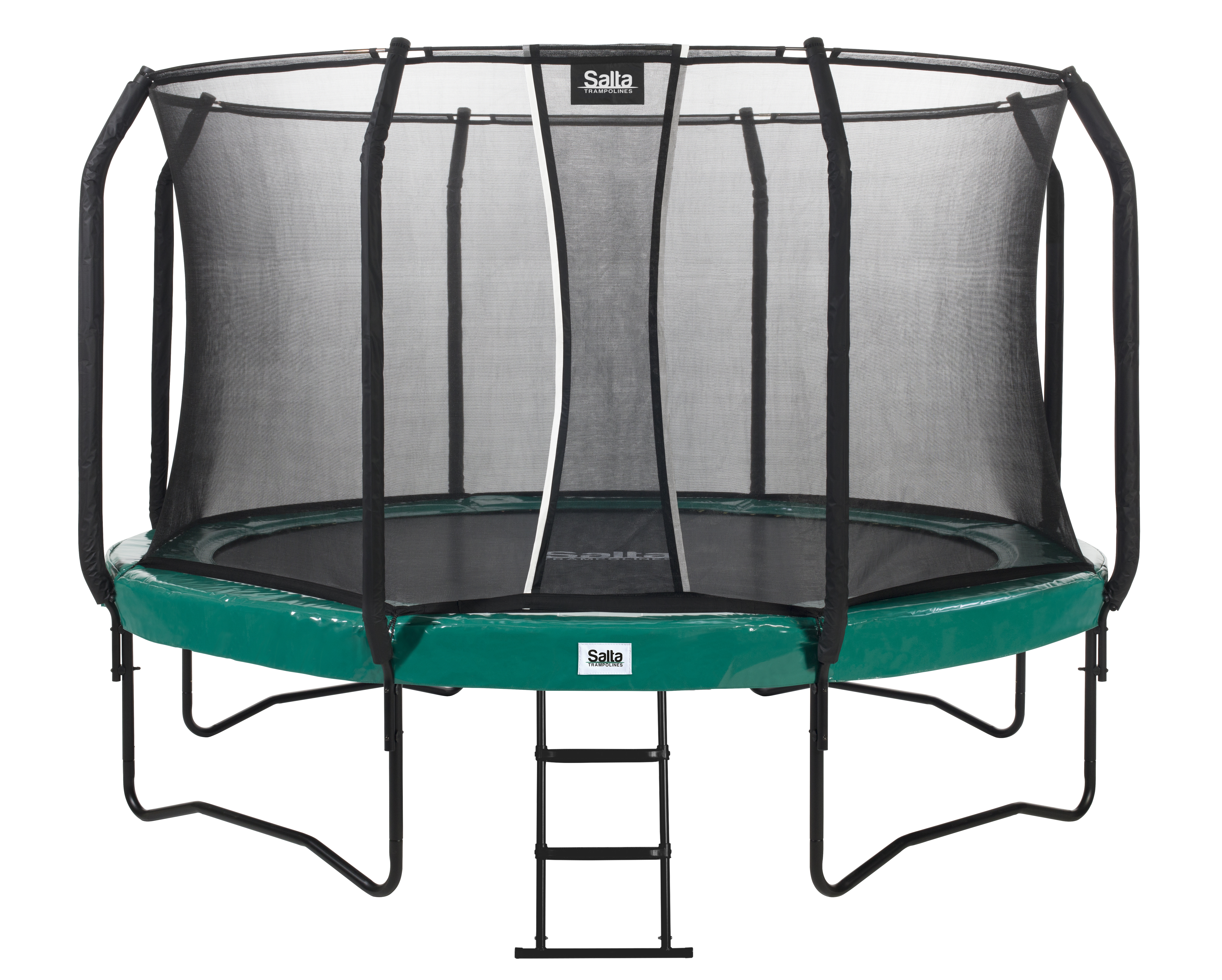 Der Schutzrand ist mit ca. 37 cm extra breit. Er ist mit einer Folienstärke von ca. 0,76 mm und einer Füllung von ca. 32 mm sehr stark gepolstert und aus einem sehr guten, UV-beständigen und sehr verschleißfesten PVC-Material hergestellt. Nach innen ist der Schutzrand doppelt vernäht und überdeckt somit die Sprungfedern und die Sprungmatte optimal. Das extra für das Salta First Class Trampoline entwickelte Sprungtuch ist 8-fach vernäht. Die mit 210 mm extra langen goldfarbene konischen Doppelkegelfedern sorgen mit dem optimalen Verhältnis zwischen Länge, Durchmesser, Form und Spannung der Federn für die optimale Rückfederung. Sie können somit höher Springen und auch weicher landen. Das speziell neu entwickelte Sicherheitsnetz ist aus einem sehr guten, UV-beständigen, sehr verschleißfesten und engmaschigen Material hergestellt. Es fühlt sich dadurch sehr weich an. Es ist im oberen Bereich mit einem Fiberglasoberring ausgestattet und hält somit das Netz immer sicher und gut in Form. Die Netzpfosten sind mit dicken Schaumpolster überzogen. Das Salta “First Class” Trampoline wird inclusive einer sehr hochwertigen Leiter ausgeliefert.