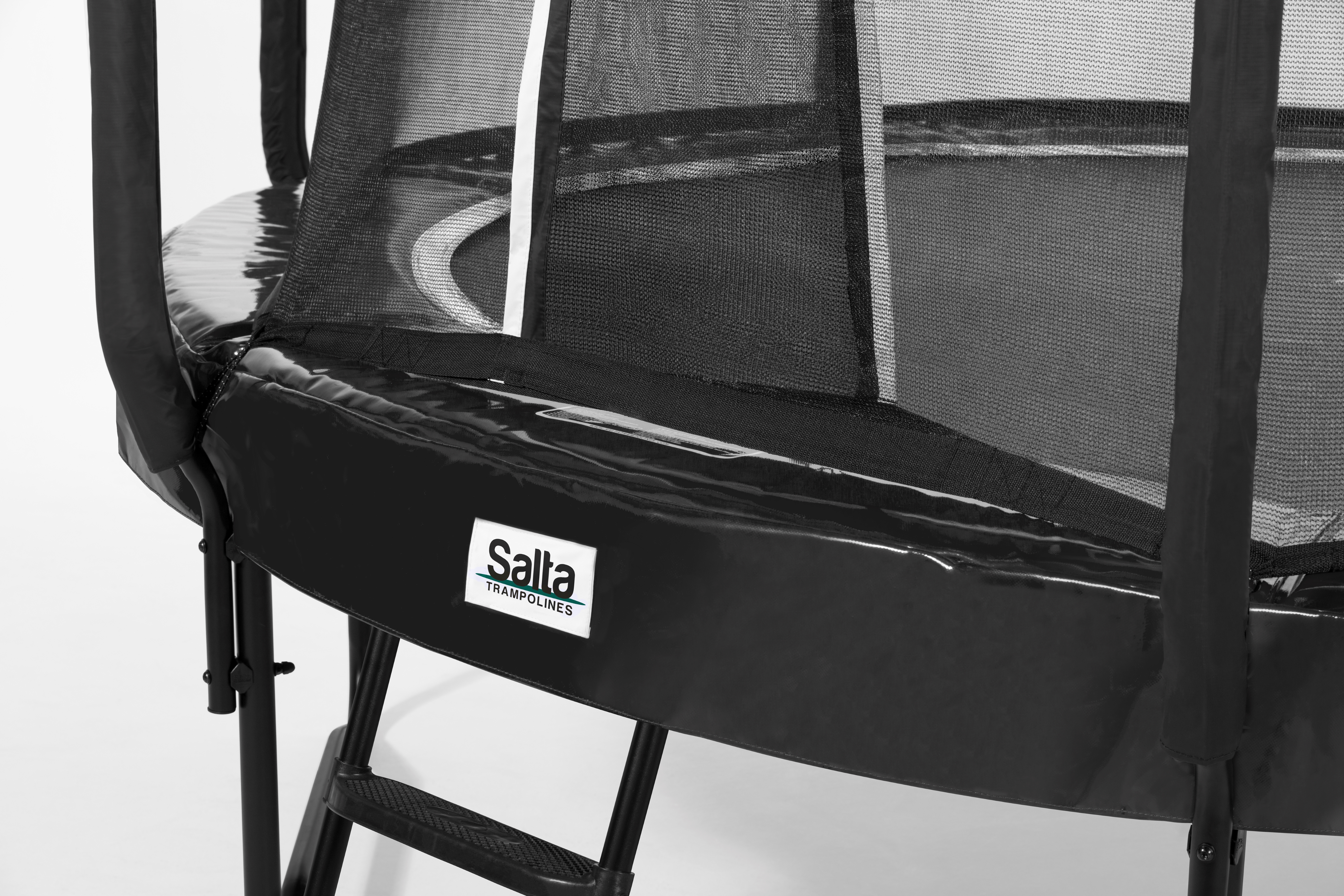 Der Schutzrand ist mit ca. 37 cm extra breit. Er ist mit einer Folienstärke von ca. 0,76 mm und einer Füllung von ca. 32 mm sehr stark gepolstert und aus einem sehr guten, UV-beständigen und sehr verschleißfesten PVC-Material hergestellt. Nach innen ist der Schutzrand doppelt vernäht und überdeckt somit die Sprungfedern und die Sprungmatte optimal. Das extra für das Salta First Class Trampoline entwickelte Sprungtuch ist 8-fach vernäht. Die mit 210 mm extra langen goldfarbene konischen Doppelkegelfedern sorgen mit dem optimalen Verhältnis zwischen Länge, Durchmesser, Form und Spannung der Federn für die optimale Rückfederung. Sie können somit höher Springen und auch weicher landen. Das speziell neu entwickelte Sicherheitsnetz ist aus einem sehr guten, UV-beständigen, sehr verschleißfesten und engmaschigen Material hergestellt. Es fühlt sich dadurch sehr weich an. Es ist im oberen Bereich mit einem Fiberglasoberring ausgestattet und hält somit das Netz immer sicher und gut in Form. Die Netzpfosten sind mit dicken Schaumpolster überzogen. Das Salta “First Class” Trampoline wird inclusive einer sehr hochwertigen Leiter ausgeliefert.