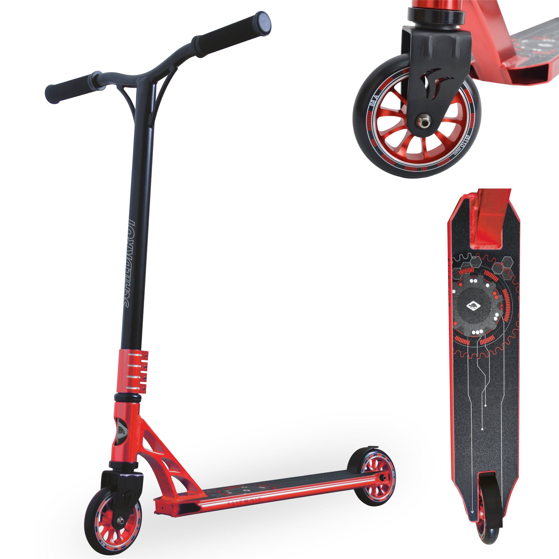 - Tolle CNC Ausfräsung in Headtube, wertiger HIC-Compression-Steuersatz, 110 mm Hi-Rebound PU Räder (Härtegrad 88A), hochwertige eloxierte Alufelge, die auch extremsten Sprüngen und Stunts standhält