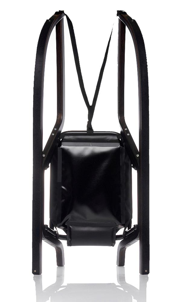 Elegantes dunkles Design, 115cm Gesamtlänge, 6.8kg Gesamtgewicht, Thermoverformtes FSC Buchenschichtholz, Hoch verschleissfeste PE-1000 Kunstoffkufen, Wasser- und ressfestes Polestergewebe für den Sitz, Ressfestes Zug- und Steuerband, Platzsparender Stapelbar, 100% SWISS MADE
