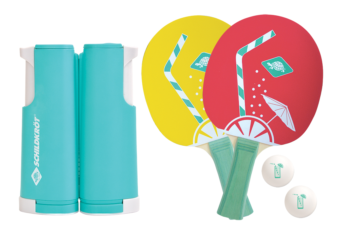 Dank dem neuen Tischtennisset „Spin“ von Donic-Schildkröt brauchen Freunde eines gepflegten Tischtennisduells nicht mehr zwingend eine Tischtennisplatte, sondern lediglich einen stabilen Tisch – so kann immer und (fast) überall eine Partie gespielt werden.Das Set verfügt über 2 Schläger in guter Freizeitqualität, 2 Tischtennisbälle sowie ein neuartiges, ausziehbares Tischtennisnetz.