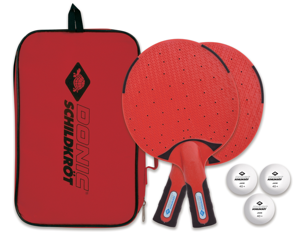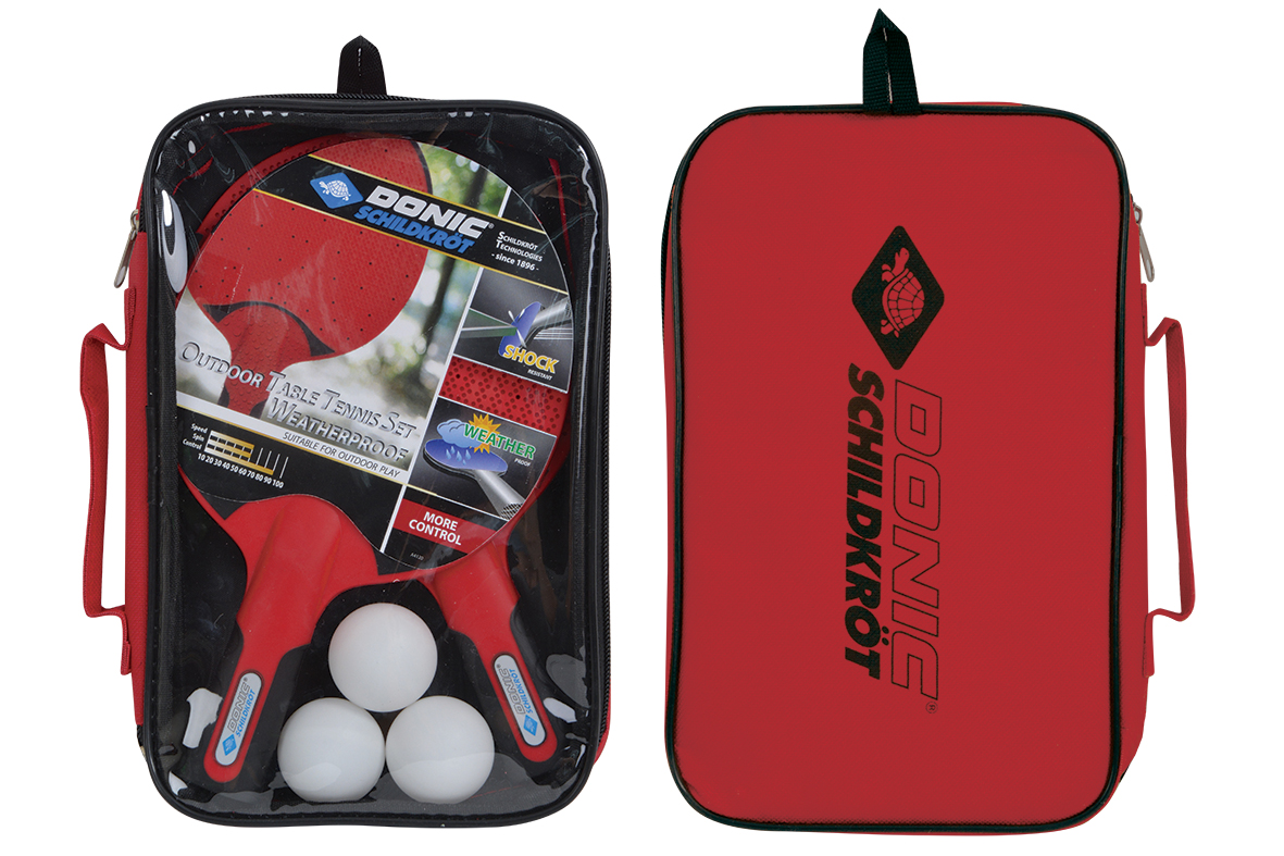 Das Outdoor Weatherproof Set von Donic-Schildkröt beinhaltet 2 Stk. der neuen innovativen Outdoor-Schläger aus einem 2-Komponenten-Kunststoff. Ein harter verwindungssteifer Kern aus schwarzem Kunststoff plus ein zweiter aufgespritzter weicher, griffiger (gummiartiger) Kunststoff in Rot für Griffigkeit, sicheren Schlägerhalt, Spin, Beschleunigung etc. Diese neuartigen Schläger können problemlos mit jedem Freizeitschläger aus Holz mithalten! Gleichzeitig sind sie wasserfest (können also auch mal bei Regen im Garten vergessen werden), sie sind abwaschbar und somit hygienischer (ideal für öffentliche Einrichtungen wie Schulen, Jugendclubs, Pfarrheime etc.). Außerdem sind sie deutlich robuster, sie können runterfallen ohne dass ein Holz splittern kann. Ebenfalls im Set enthalten sind drei Tischtennisbälle in guter Freizeit-Qualität sowie die praktische, wiederverschließbare Tragetasche zur sauberen Aufbewahrung des Sets.Hier finden Sie weitere Produkte
