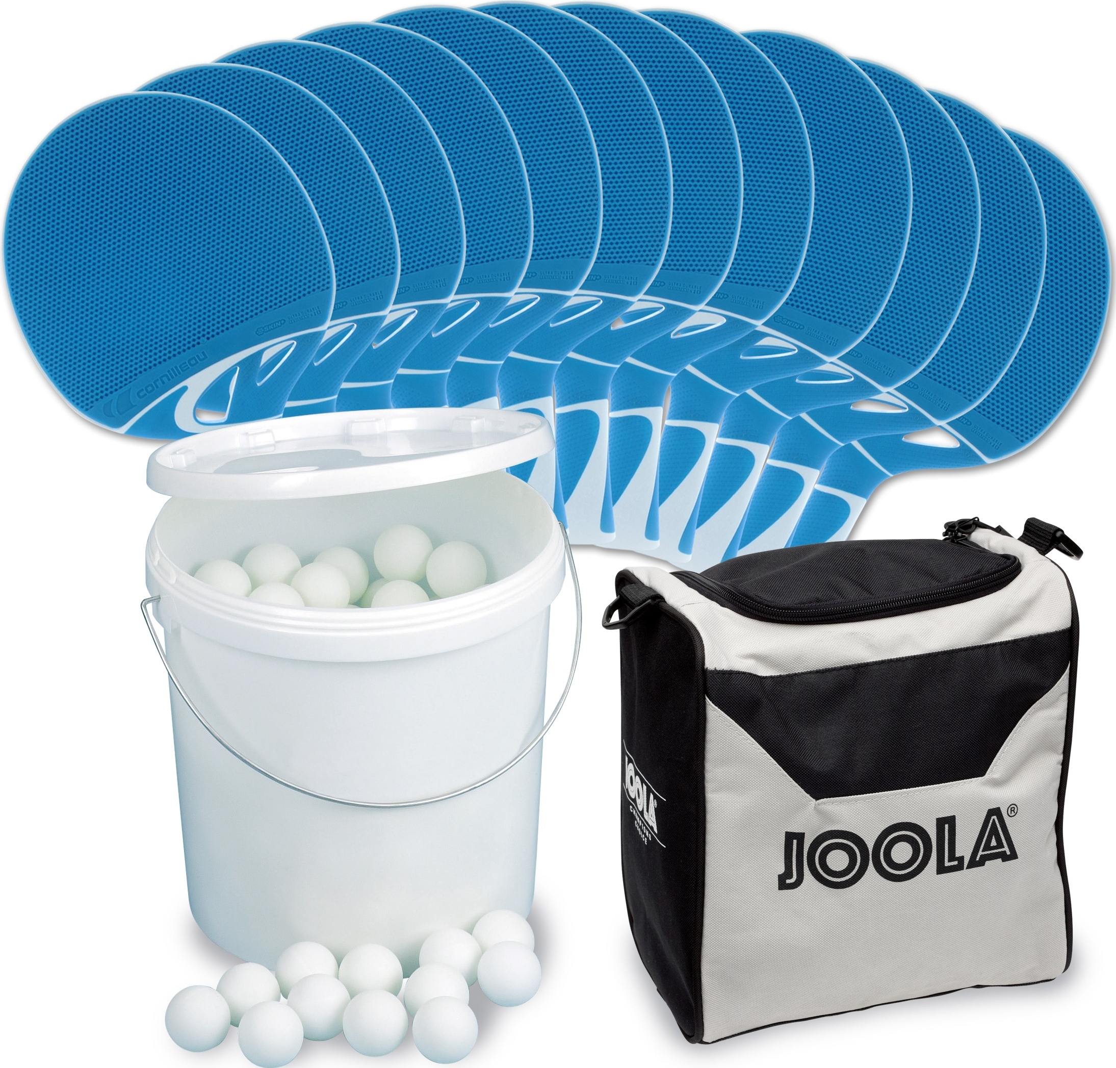 Zusätzlich zur Tasche beinhaltet das Set einen Balleimer mit 144 Trainingsbällen und 10 robuste Schläger 'Tacteo 30'.
