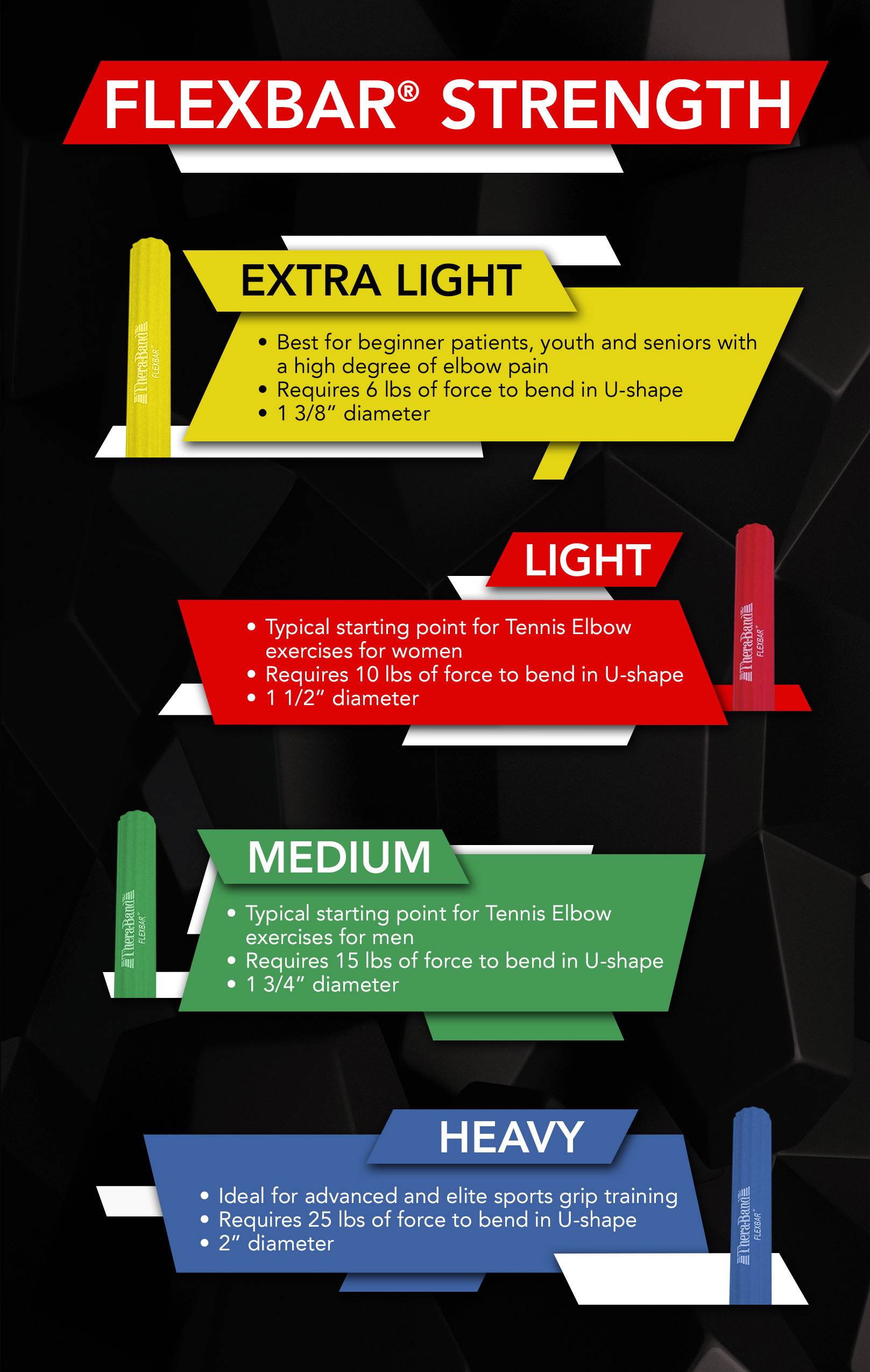 Die gerillte Gummioberfläche bietet einen optimalen Griff und ist bei intensivem Gebrauch durch unterschiedliche Nutzer einfach zu reinigen. Der flexible Übungsstab ist in vier farbcodierten Widerständern mit unterschiedlichen Durchmessern verfügbar.
