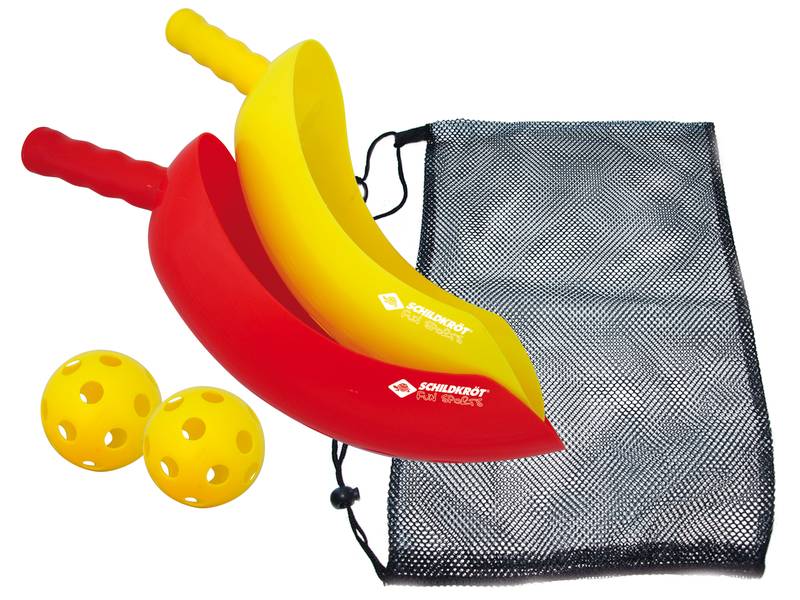 Mit Scoop Ball präsentiert Schildkröt Funsports ein beliebtes Geschicklichkeitsspiel, bei dem man variable Wurf- und Fangtechniken ähnlich dem Lacrosse trainieren kann. Das Set kommt mit zwei Scoop Ball Schlägern (Länge 40cm) jeweils aus rotem und gelbem Kunststoff und zwei dazugehörigen Loch-Bällen (Durchmesser 9cm). Ein Set für überall, praktisch verpackt in einer wiederverschließbaren Netztasche mit Kordelzug.Hier finden Sie weitere Produkte